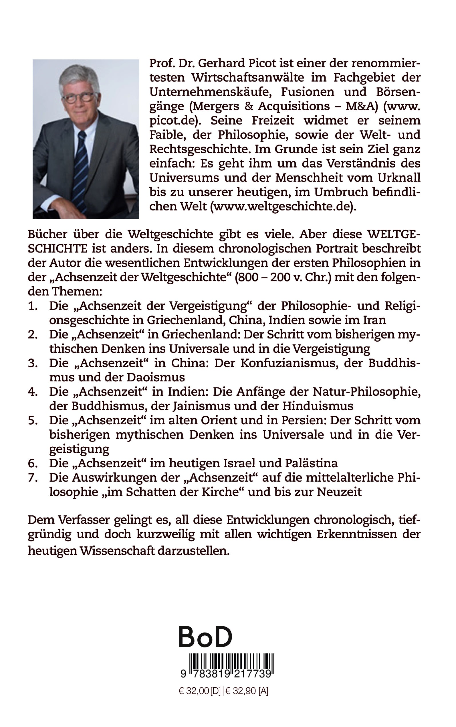 Prof. Dr. Gerhard Picot ist einer der renommiertesten Wirtschaftsanwälte im Fachgebiet der Unternehmenskäufe, Fusionen und Börsengänge (Mergers & Acquisitions – M&A) (www.picot.de). Seine Freizeit widmet er seinem Faible, der Philosophie, sowie der Welt- und Rechtsgeschichte. Im Grunde ist sein Ziel ganz einfach: Es geht ihm um das Verständnis des Universums und der Menschheit vom Urknall bis zu unserer heutigen, im Umbruch befindlichen Welt (www.weltgeschichte.de).